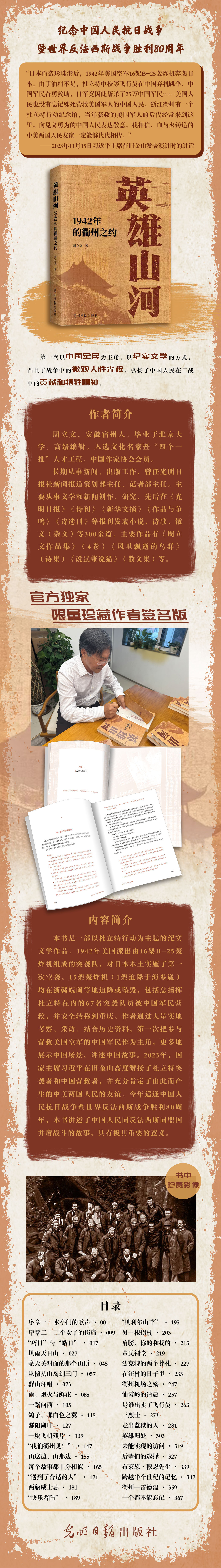 衢州市委常委、宣传部部长邓崴介绍,近年来,衢州深入挖掘“杜立特行动大救援”这一宝贵的历史资源,成立杜立特行动历史研究会,持续举办“我们衢州见(SeeYouinQuzhou)”国际人文交流活动,努力为中美民间友好、服务国家总体外交作出衢州贡献。本次发布的《英雄山河》,是第一部以“杜立特行动大救援”为题材的报告文学作品,作者以史学的严谨,诗性的语言,不但重现了83年前的历史现场,更让读者感受到那段历史在当下的回响。