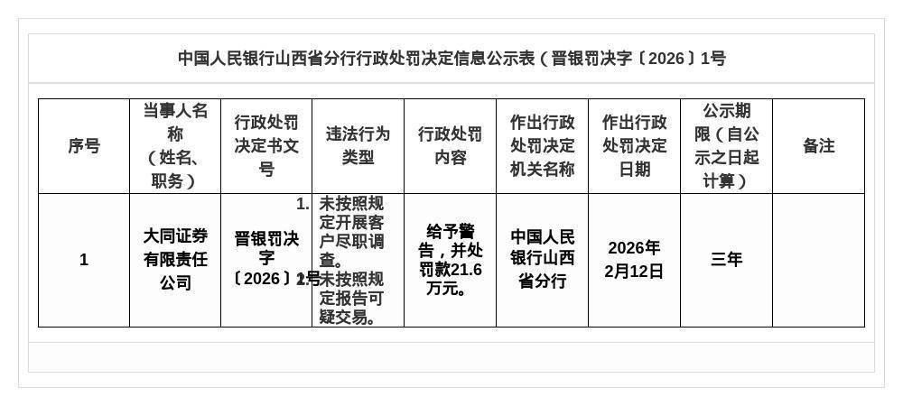 罚单显示,大同证券有限责任公司的主要违法违规事实包括:未按照规定开展客户尽职调查和未按照规定报告可疑交易。