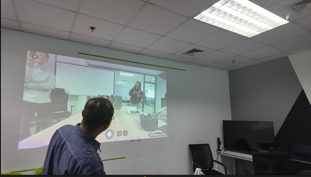 随着设备启动,机身前端的双摄像头缓缓旋转,对准正在讲话的人。会议画面自动出现在大屏幕上,声音通过设备内置麦克风清晰传出。
