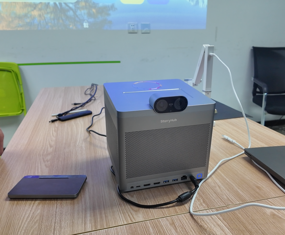 记者看到,这个设备体积不大,连接方式也十分简单。刘兴宝只用一根HDMI线,就把它接入会议室原有的大屏电视。几秒钟后,屏幕界面发生变化,原本普通的大屏幕变成了智能会议系统,可以进行语音识别、会议记录和远程协作。
