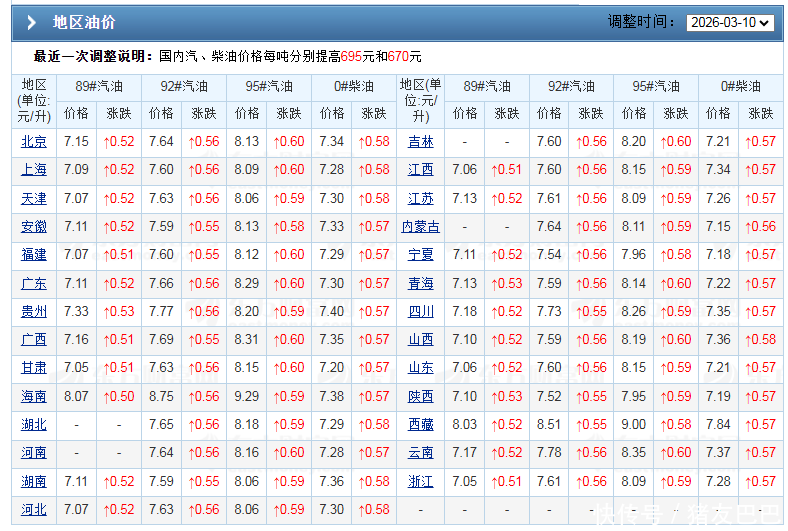 与此同时,在成品油市场,国内油价呈现“单边”上涨的走势!上一次汽柴油调价,本周初,基于中东局势全面升温,上周原油大涨超35.3%,2026年第5次调价,汽柴油迎来“4连涨”,此次油价普遍上涨0.55~0.6元/升,涨幅创下近4年新高!此次油价上涨后,国内92汽油普遍涨超7.6元/升,95汽油普遍涨超8.1元/升,油价呈现“破位”上涨的局面。目前,各地最新油价更新,大家相互了解!