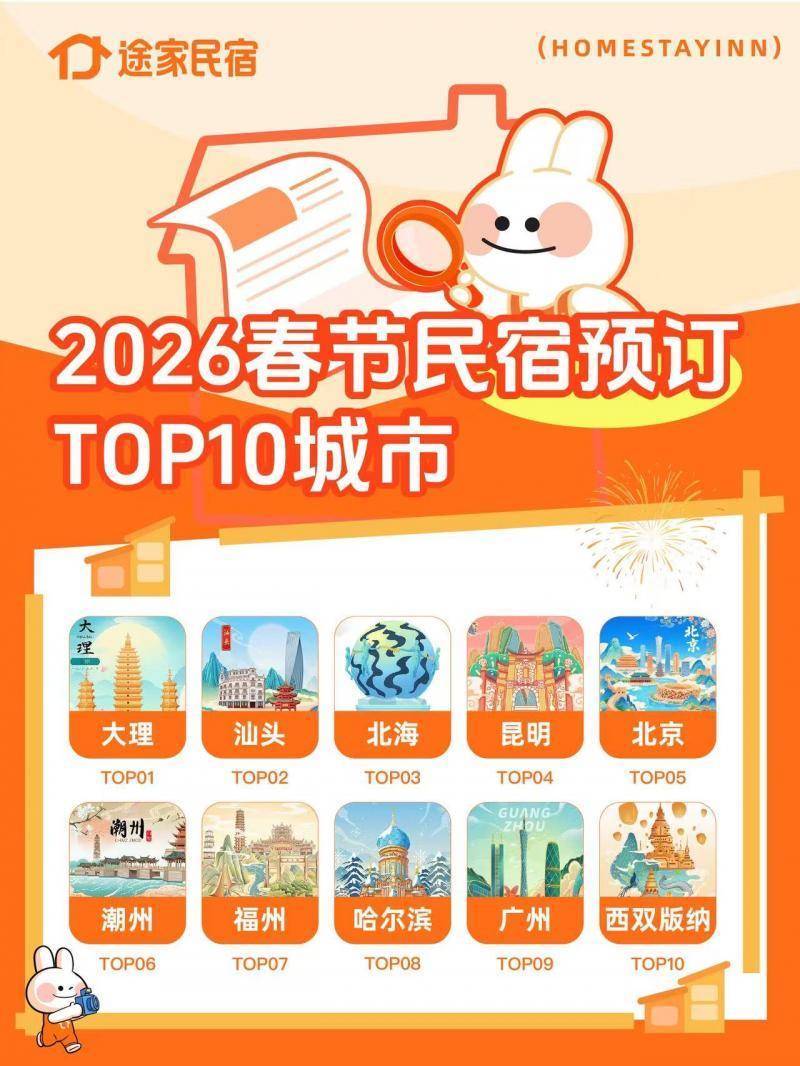 据途家数据,云南、广东、福建、广西、浙江等地,是春节民宿预订最火爆的目的地。而最受游客青睐的城市既包括大理、汕头、北海、潮州等温暖的南方重镇,也有春晚分会场之一、冰雪旅游顶流哈尔滨以及文化核心北京。