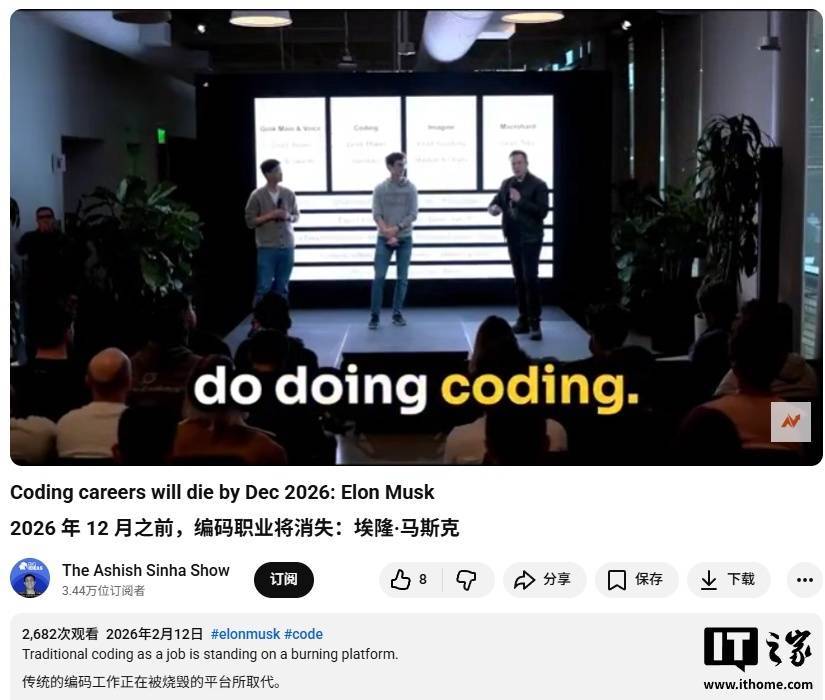 IT之家 2 月 15 日消息,2 月 12 日,特斯拉 CEO 埃隆 · 马斯克在 The Ashish Sinha Show 节目中谈到了自己对于 AI 编码的看法。