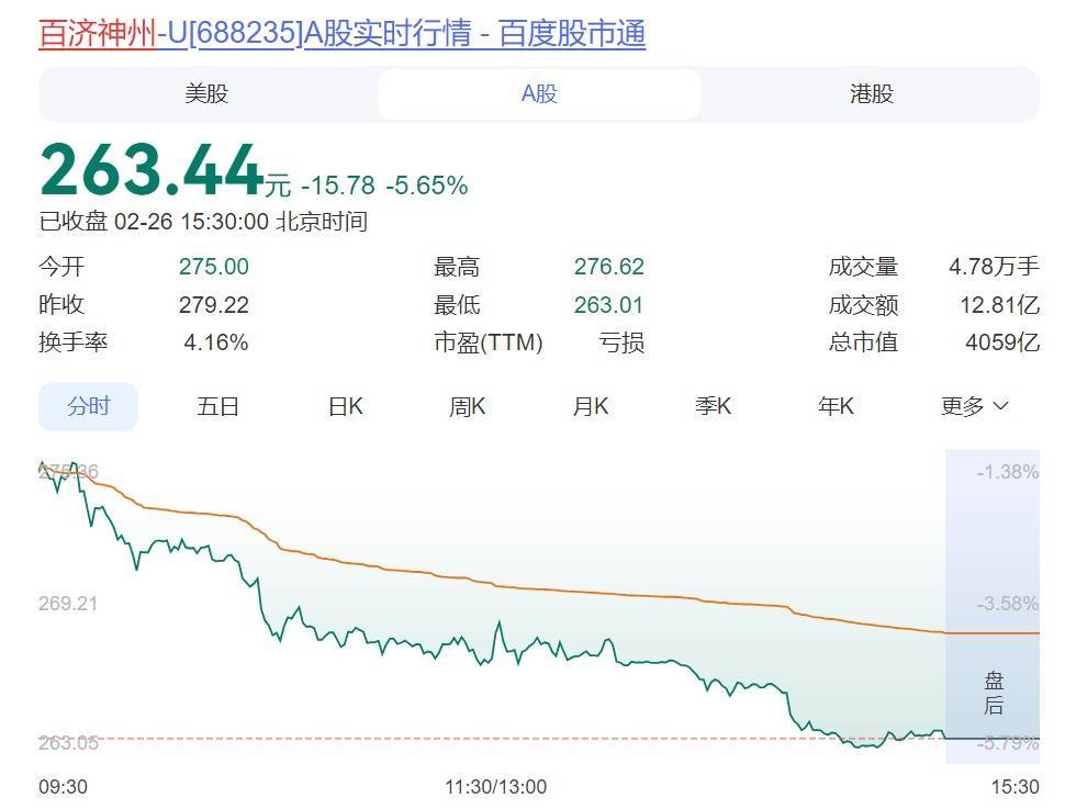 截至2月26日收盘,百济神州股价跌5.65%,报263.44元/股。