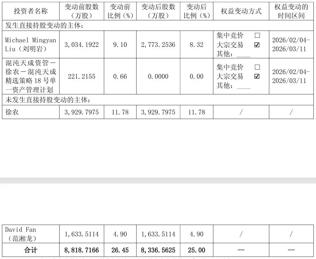 3月12日,三友医疗(688085)公告,近日,公司收到MichaelMingyan Liu(刘明岩)先生及徐农先生出具的《告知函》,2026年2月4日至2026年3 月11日,MichaelMingyanLiu(刘明岩)先生通过大宗交易方式合计减持公司股份2,609,386股,占公司总股本的0.78%;徐农先生的一致行动人混沌天成18号通过大宗交易方式合计减持公司股份2,212,155股,占公司总股本的0.66%。