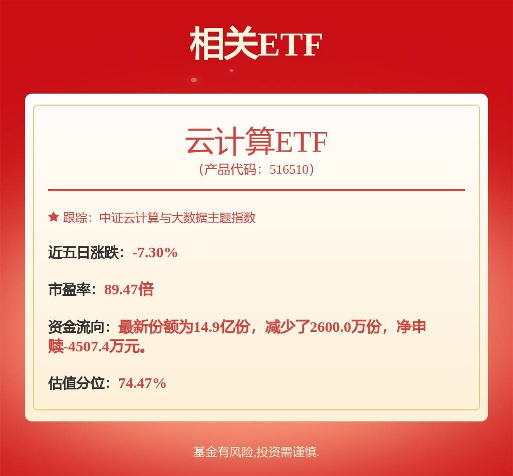 中证云计算与大数据主题指数由50只业务涉及云计算服务、大数据服务及相关硬件设备的股票组成,聚焦AI基础设施与重点应用领域。云计算ETF易方达(516510,联接基金A/C:017853/017854)跟踪该指数,管理费率仅为0.15%/年,助力投资者低成本把握云计算涨价主线机遇。